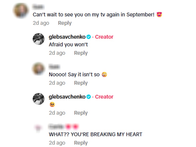 In the comment section, one TikTok user wrote, "Can't wait to see you on my TV again in September!" "Afraid you won't," he replied, seemingly confirming he won't be appearing on the reality celebrity competition show.