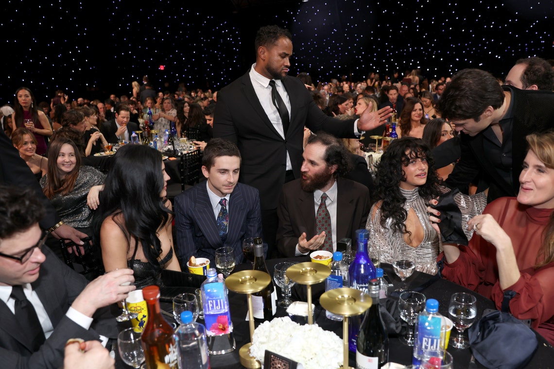 Kylie Jenner, Timothée Chalamet, Josh Safdie, Odessa A'zion, and Jennifer Venditti attend FIJI Water At The 31st Annual Critics Choice Awards at Barker Hangar on January 4, 2026 in Santa Monica, California
